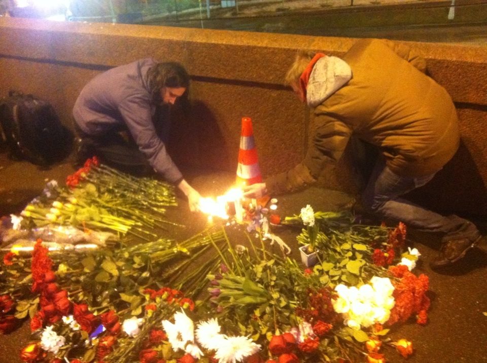 Saat ini orang-orang berdatangan membawa bunga dan lilin ke tempat penembakan Nemtsov.